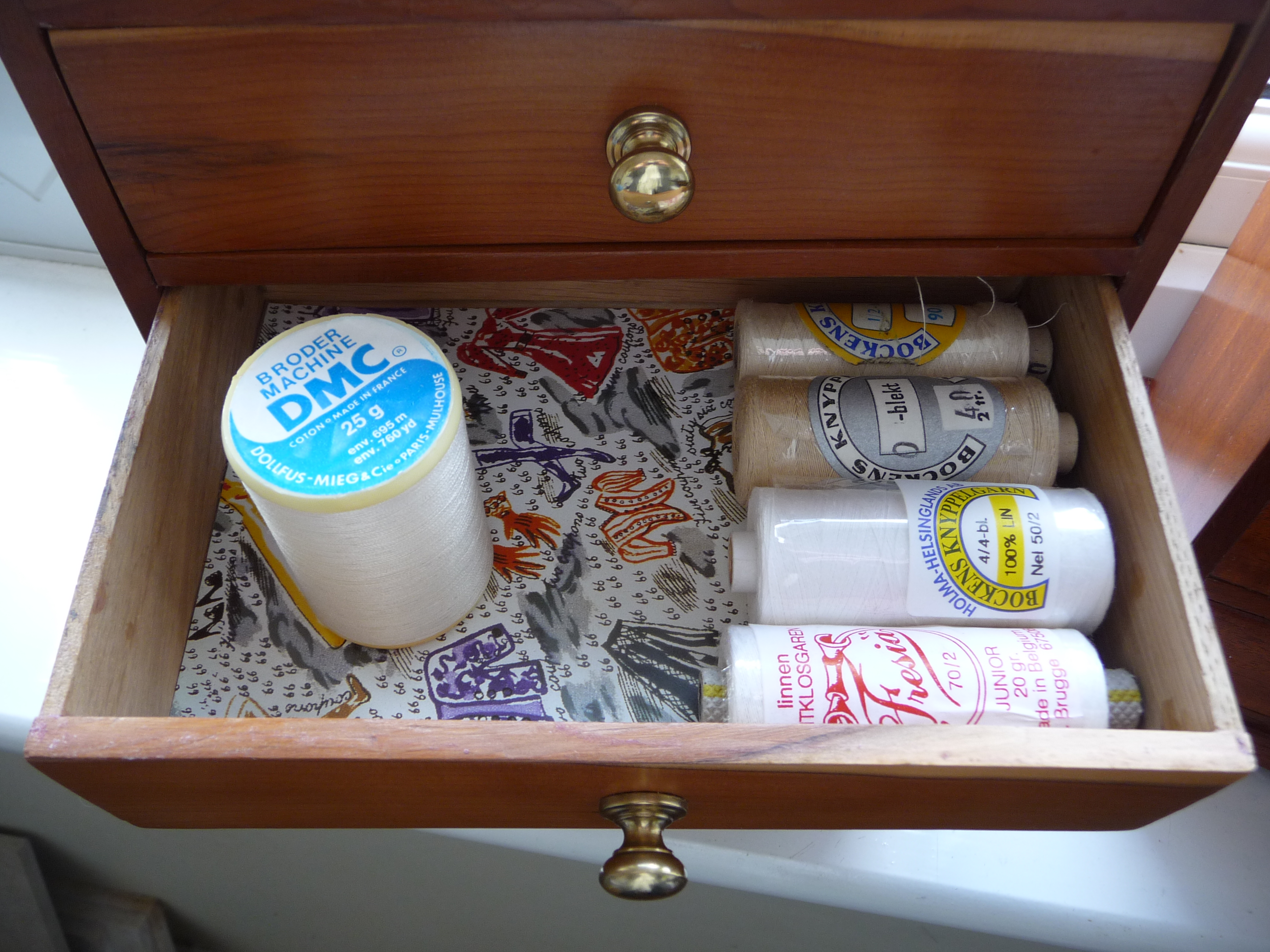 The staff are also incredibly helpful and recently sent me some endpapers which I’ve used to line the drawers of these two beautiful miniature chests which my very talented Dad made to keep my lace threads in.