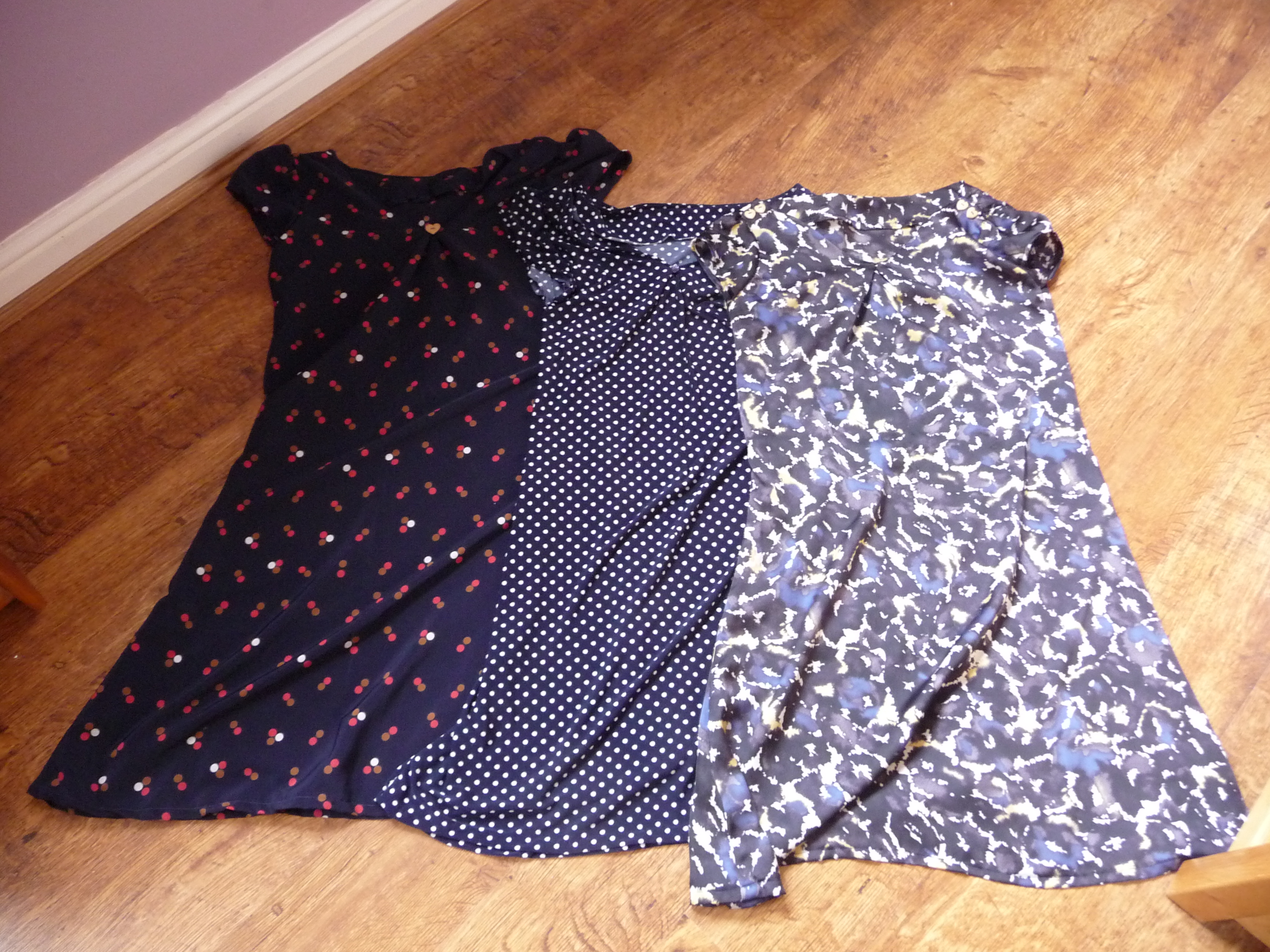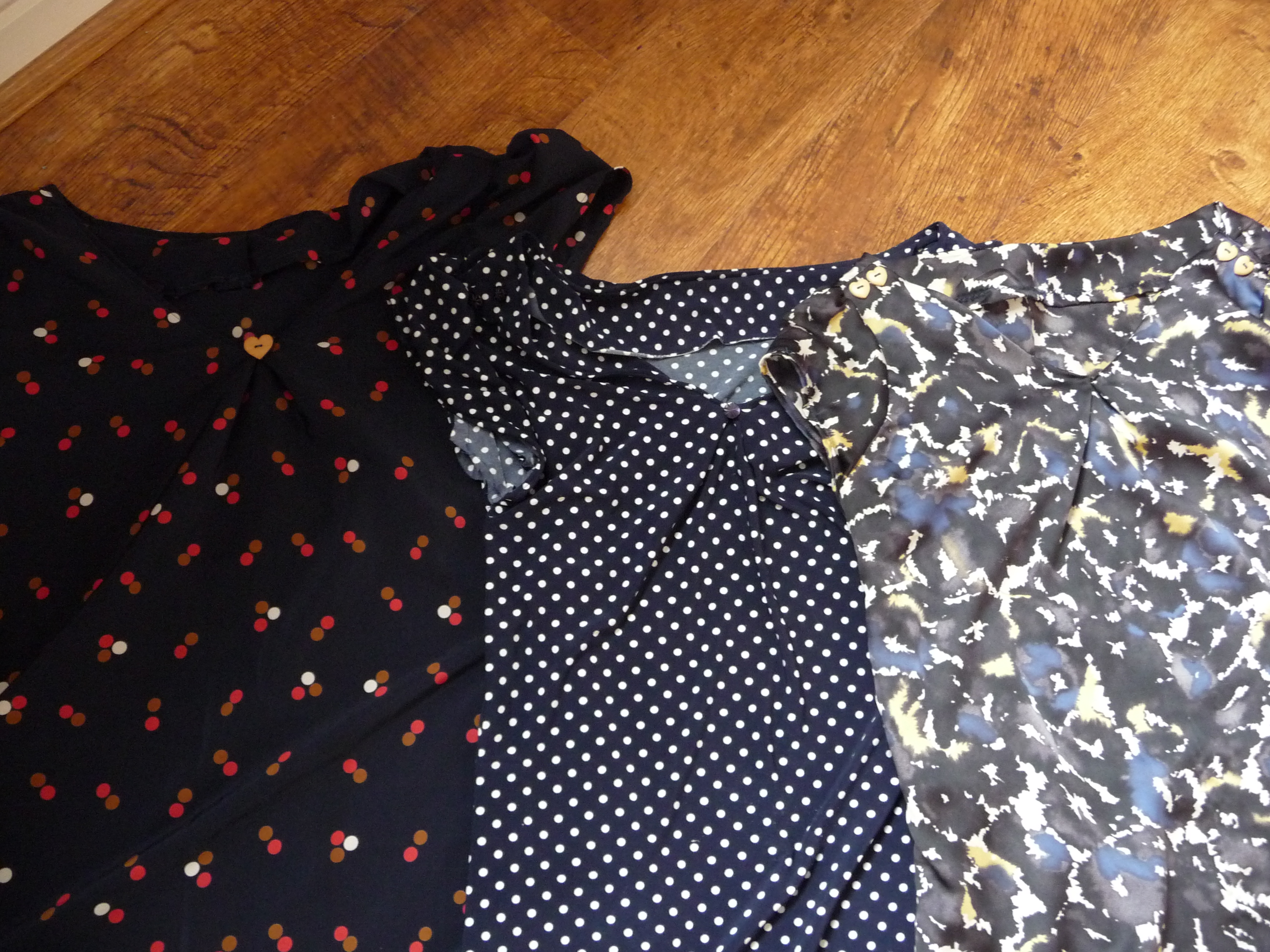 All the fabric for these was from Abakahn’s- the two on the outside are some kind of polyester/silky stuff- the right hand one was a nightmare to work with, repelling pins and fraying everywhere but the spotted one was a bit better behaved. The version in the middle is a jersey so was very forgiving for a beginner like moi.
