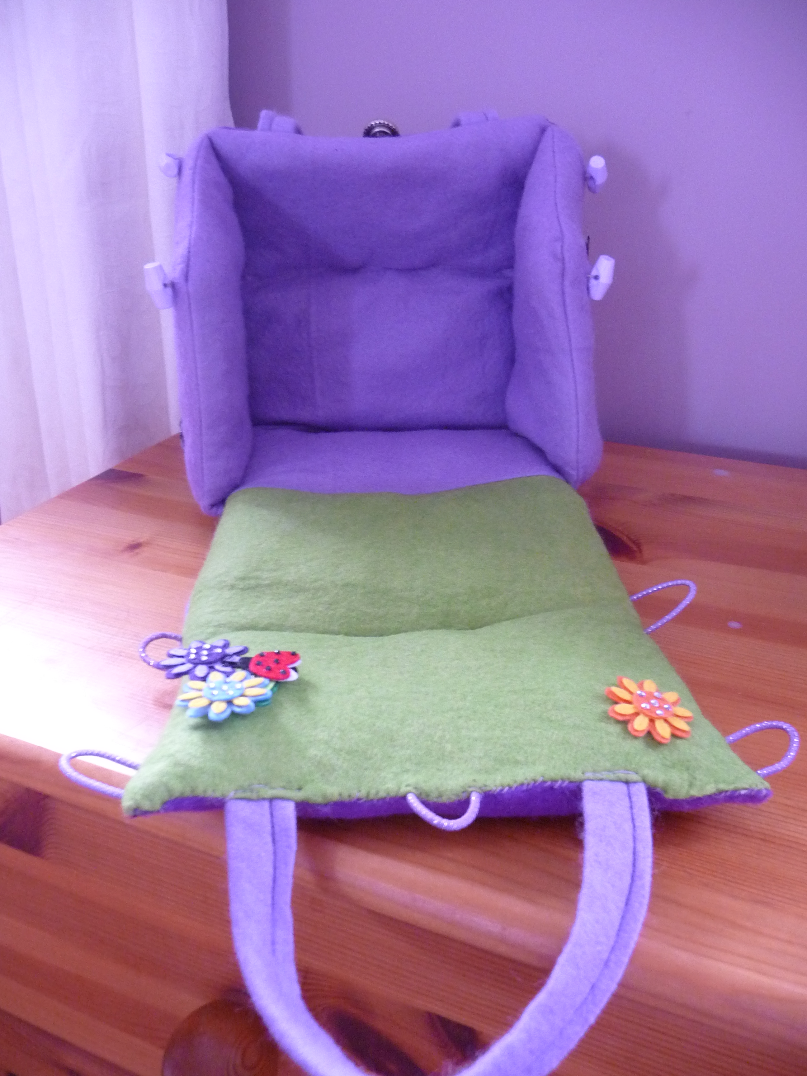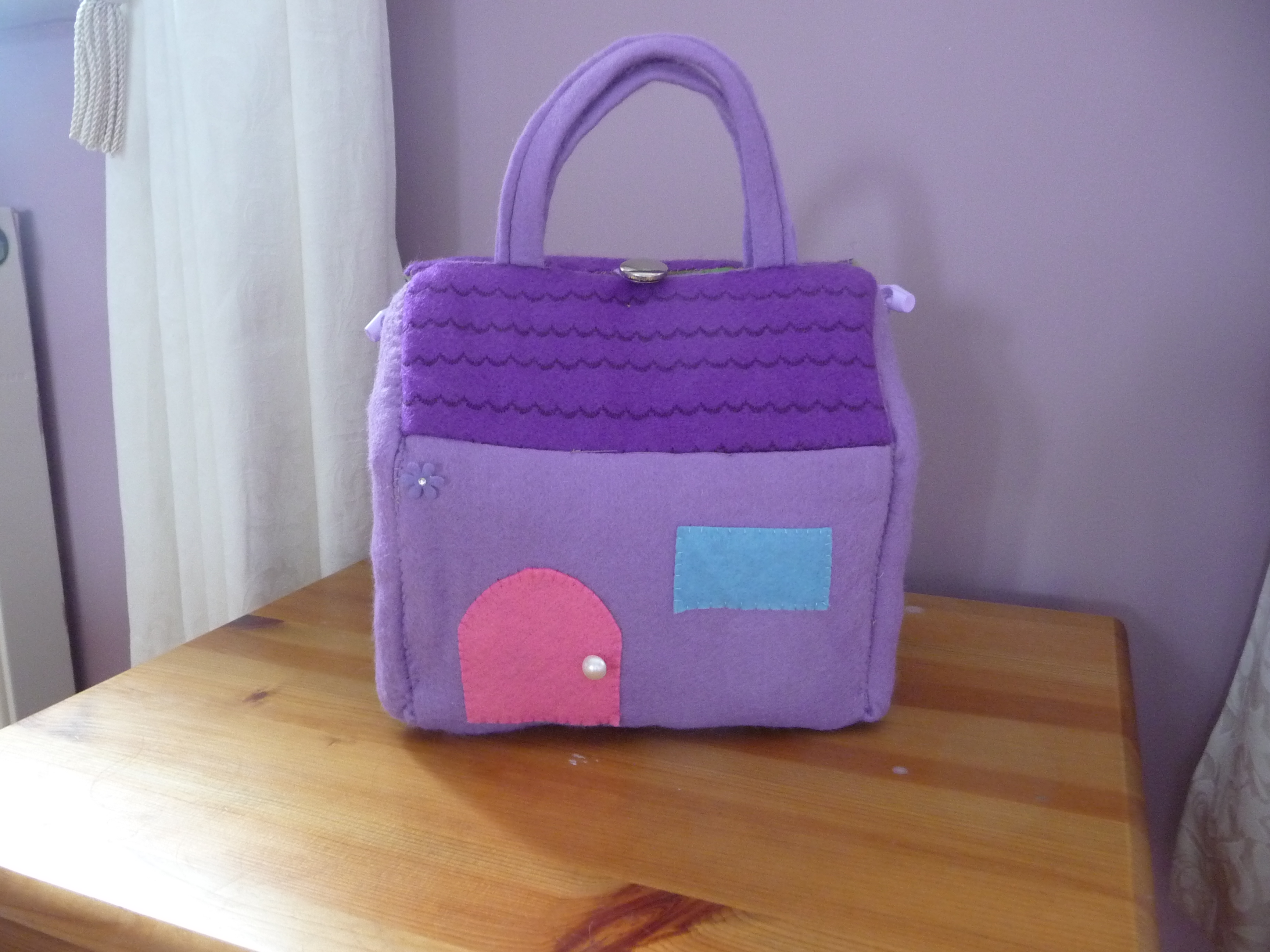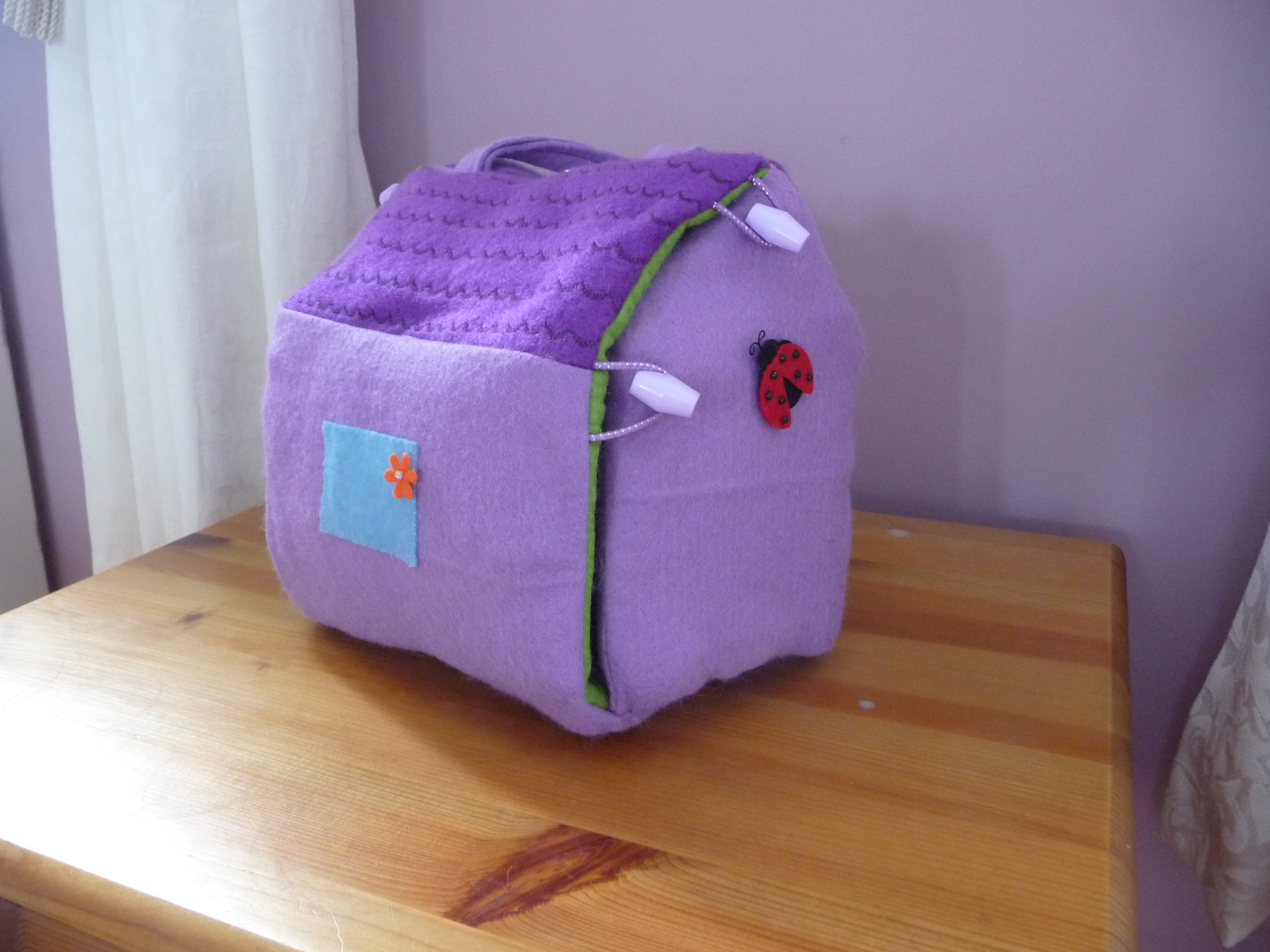 She is always talking about her imaginary purple house where her perfect ‘Purple Mummy’ lives and they do all sorts of special purple things. So now she has a real purple house. And it’s great for when we go out visiting people or for coffee- she has something really portable to take and play with. It’s just a shame that her big sister sat last night and picked all the embellishments off it so I need to repair it already <sigh>.