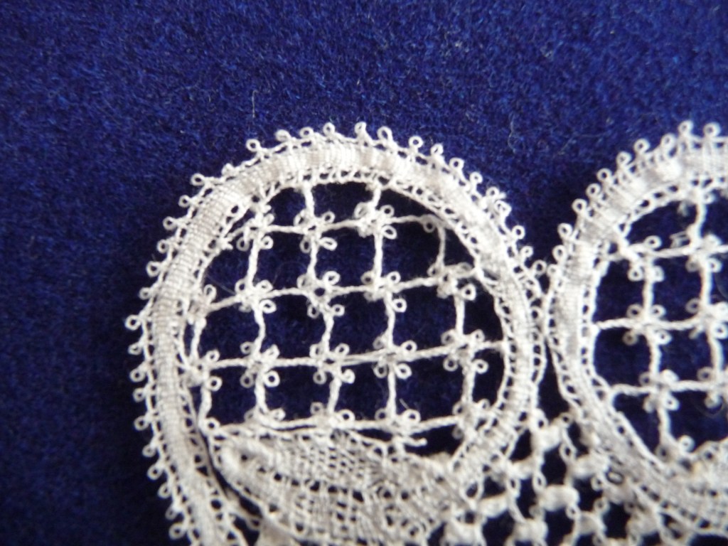 I posted last week about the disastrous Honiton perls so thought I’d make some notes here about how to get them looking better. These instructions are for perls on a trail- for perls on e.g. a blossom filling, use steps 4 to 7 (inclusive). In the images below I’m doing perls on the right hand side, which will therefore be on the left hand side once the lace is finished and turned over.