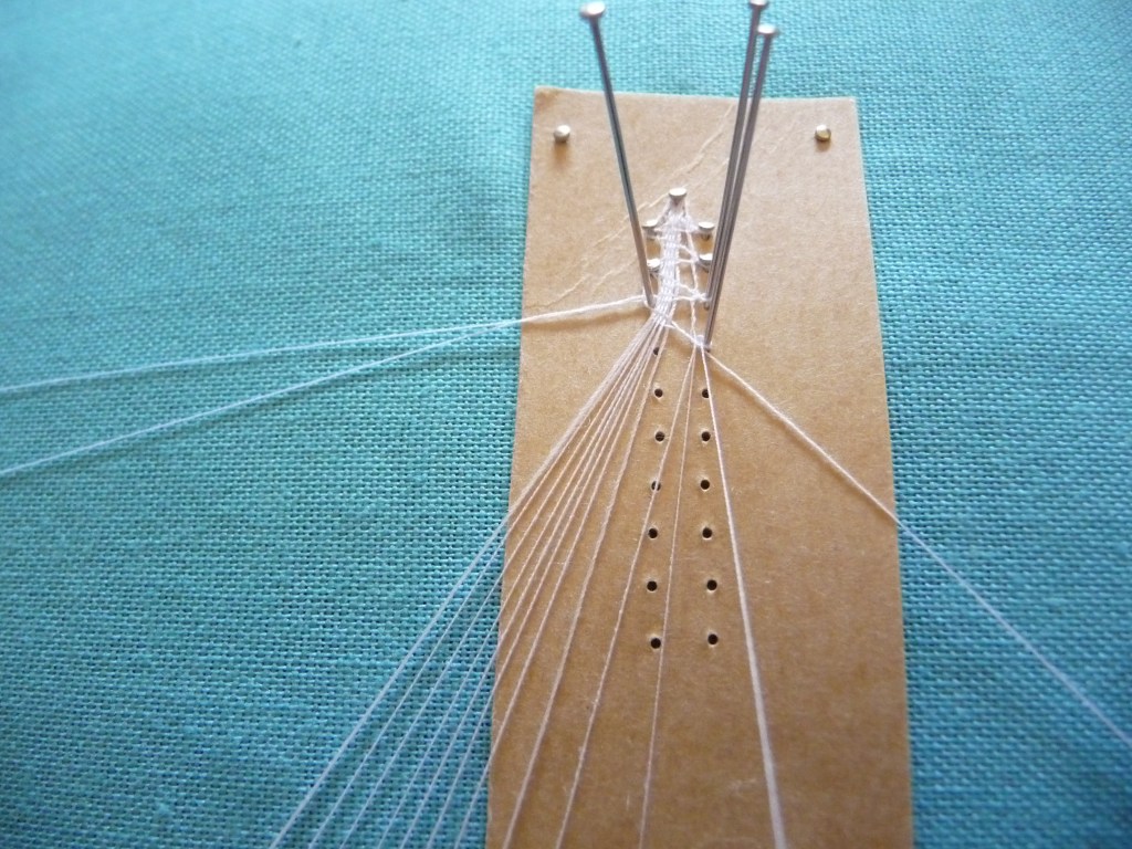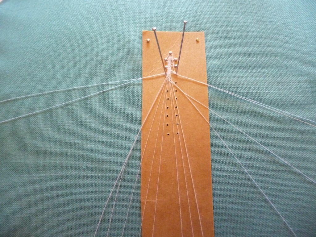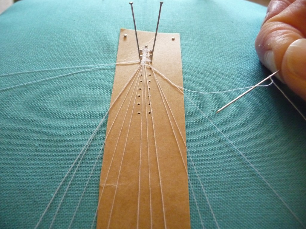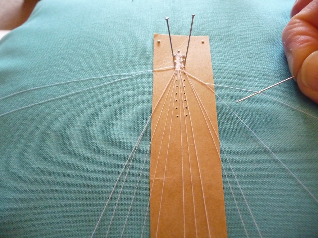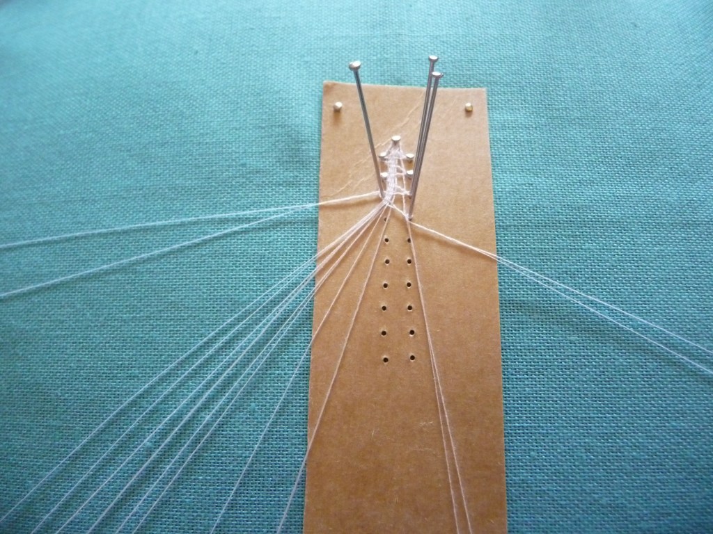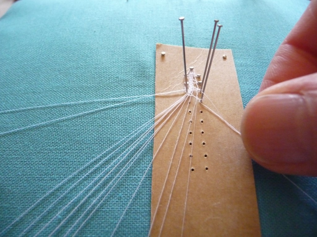 4. Take your pin, tip pointing towards the work, and wrap it round the thread towards you. Put the pin in the hole.