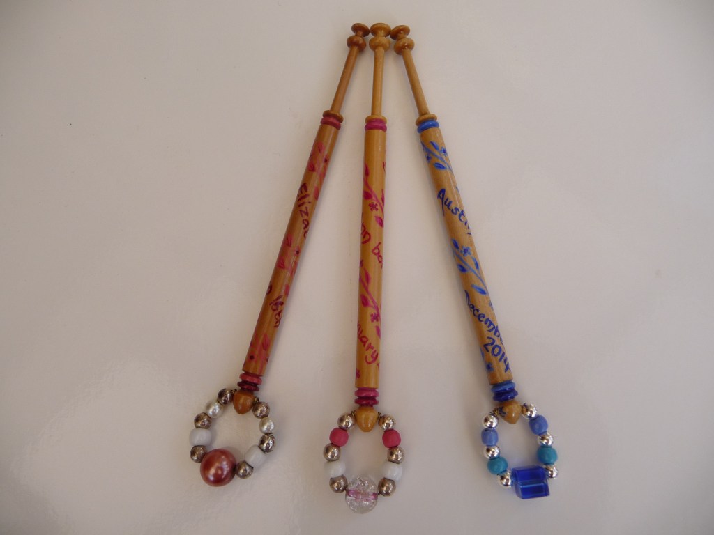 Whilst time to actually make lace has been squeezed of late, I have added to my collection of bobbins with a couple of commemoratives. Commemoratives are painted bobbins which celebrate or mark specific occasions, either personal or historic. I have quite a number now, but always get a Happy New Year one from Winslow Bobbins and have commemorated various personal milestones with a painted bobbin from the very talented Sarah Jones. The latest one was to celebrate the birth of my son and adds to the two she made me for the births of my daughters. They love looking for ‘their’ bobbins on my pillow.