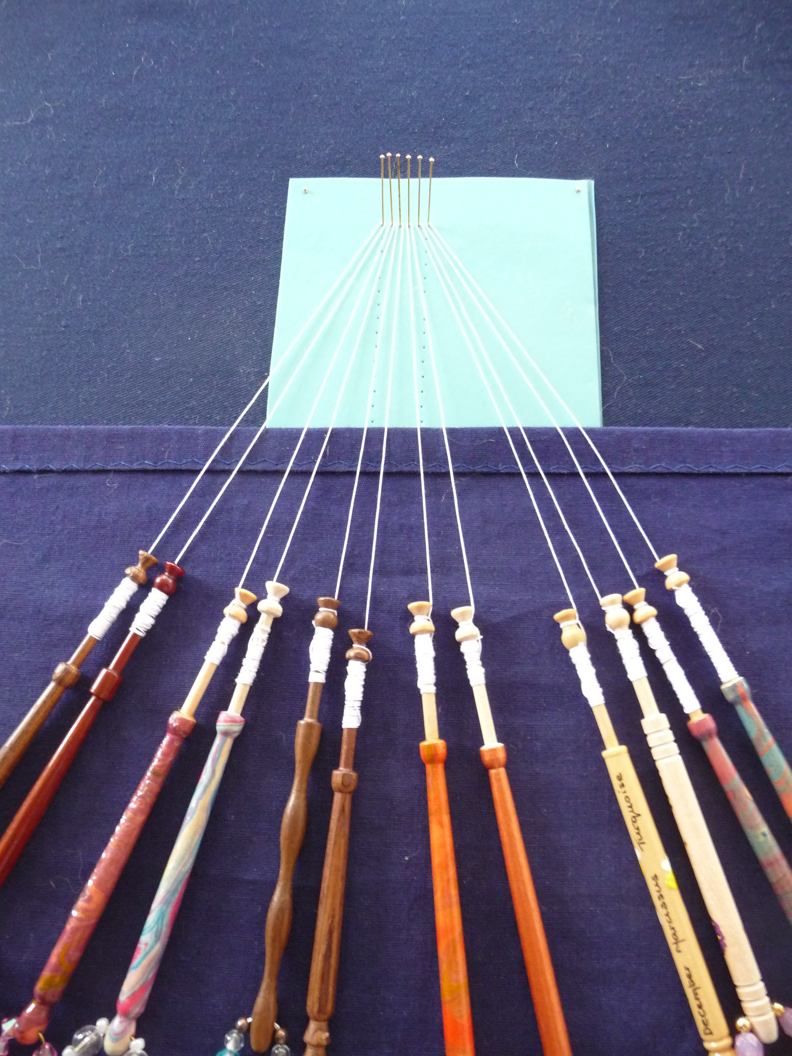 Having had a go once at painting bobbins I can completely appreciate Sarah’s talents, and those of anyone who paints bobbins. I took part in a bobbin painting workshop with Jacqui Southworth of Larkholme Lace a year or so ago, and whilst my creations are very, very far from being as good as hers, you may be more skilled in this area and get better results. The ones we did in the workshop were these rainbow ones: