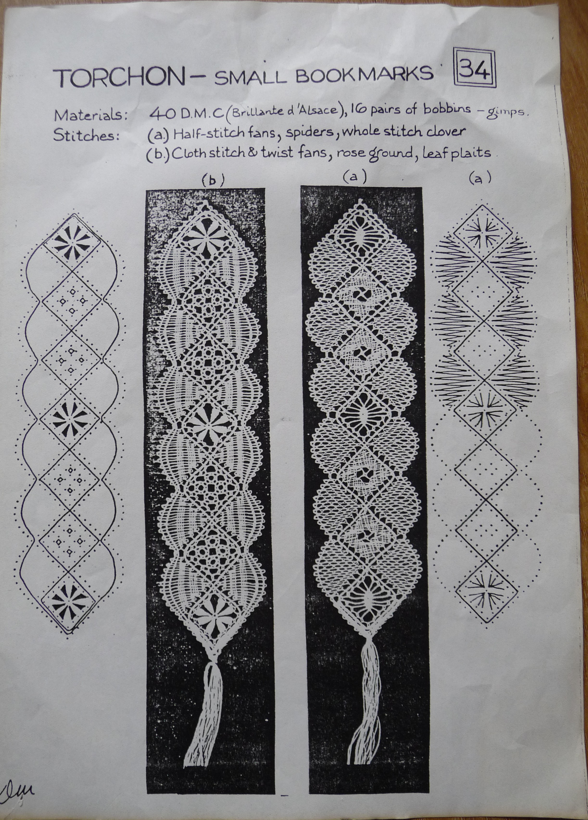 I went through my pattern files to find a bookmark I’d not made before and unearthed a pattern sheet which looks like it might be from the 1970s or 1980s but unfortunately there aren’t any designer details and I can’t make out the signature at the bottom left, so I’m afraid I can’t attribute it. I’m making design B which contains roseground, whole stitch and twist fans, and I’m going to replace the leaf plaits with spiders.
