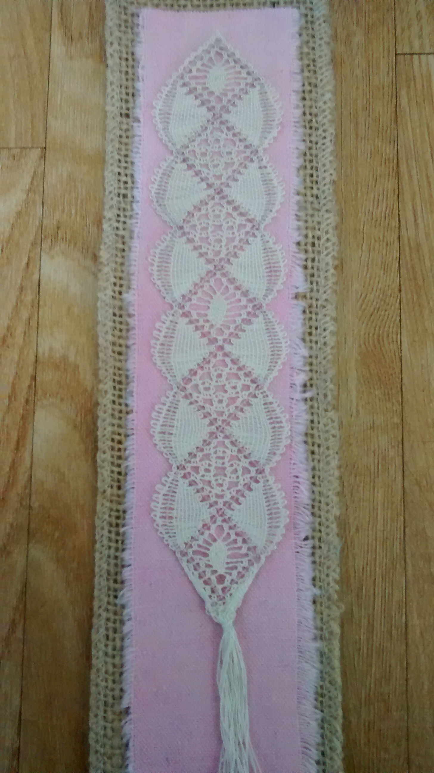I mounted the bookmark onto hessian and some pink linen ribbon which give it some stability.