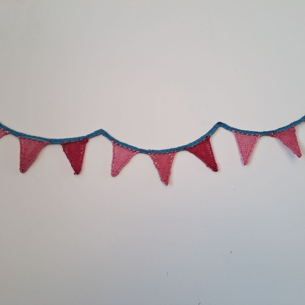 Kerry’s designs are bold and vibrant which are not necessarily words associated with traditional lace, so I wanted to make sure that what I made complemented her aesthetic. I decided on some mini rainbow bunting using a pattern designed by Claire Bonito https://www.roseground.com/product/bunting-a-milanese-design which I’ve made before, here: