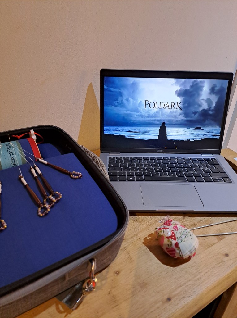 This travel pillow is the Globetrotter from Harlequin which comes with a roller and a flat cushion in a hard case. You don’t need to take the pillow out of the bag to make lace so it’s been fab to use on trips away.
