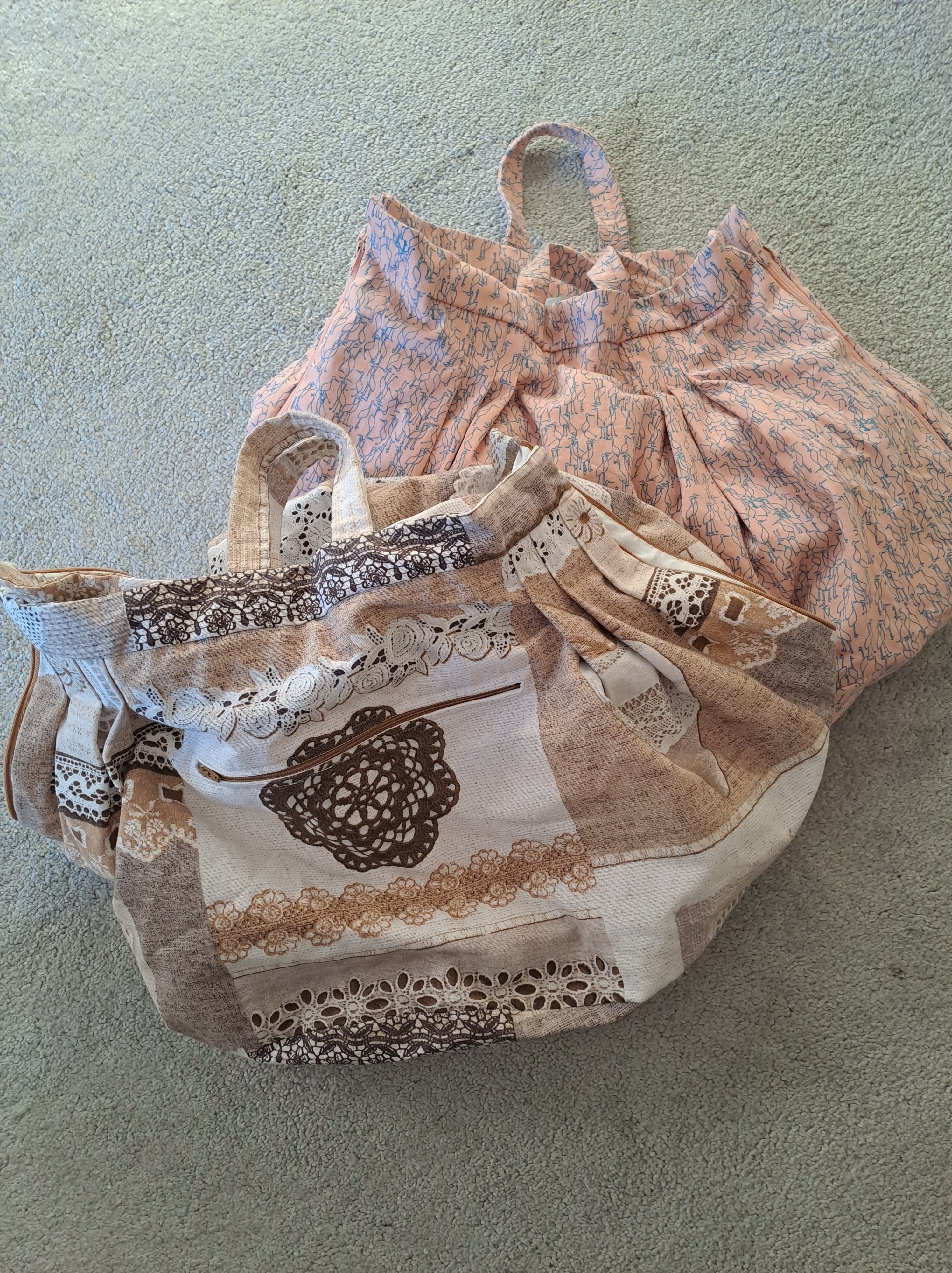 If you can use a sewing machine, I’d recommend making your own bag as you can customise it to the size (and fabric) you want and include as many pockets as you like! A really simple bag can be made using a rectangle of fabric larger than your pillow gathered at the corners, but if you want a more structured bag, I’ve made a couple of bags using this pattern by Craft House Magic (Bobbin Lace cushion carry bag sewing pattern (PDF with pattern piece p – Craft House Magic), the first using some fabric I had but didn’t need for anything else, and the second time using lace-themed cotton from Minerva- I can’t find the same fabric on their website now though unfortunately. The bag is designed with internal and external pockets and you can adjust the size to fit your pillow. I also like that it has zips either side making it easier to put the cushion in flat so that your work isn’t disrupted as much.