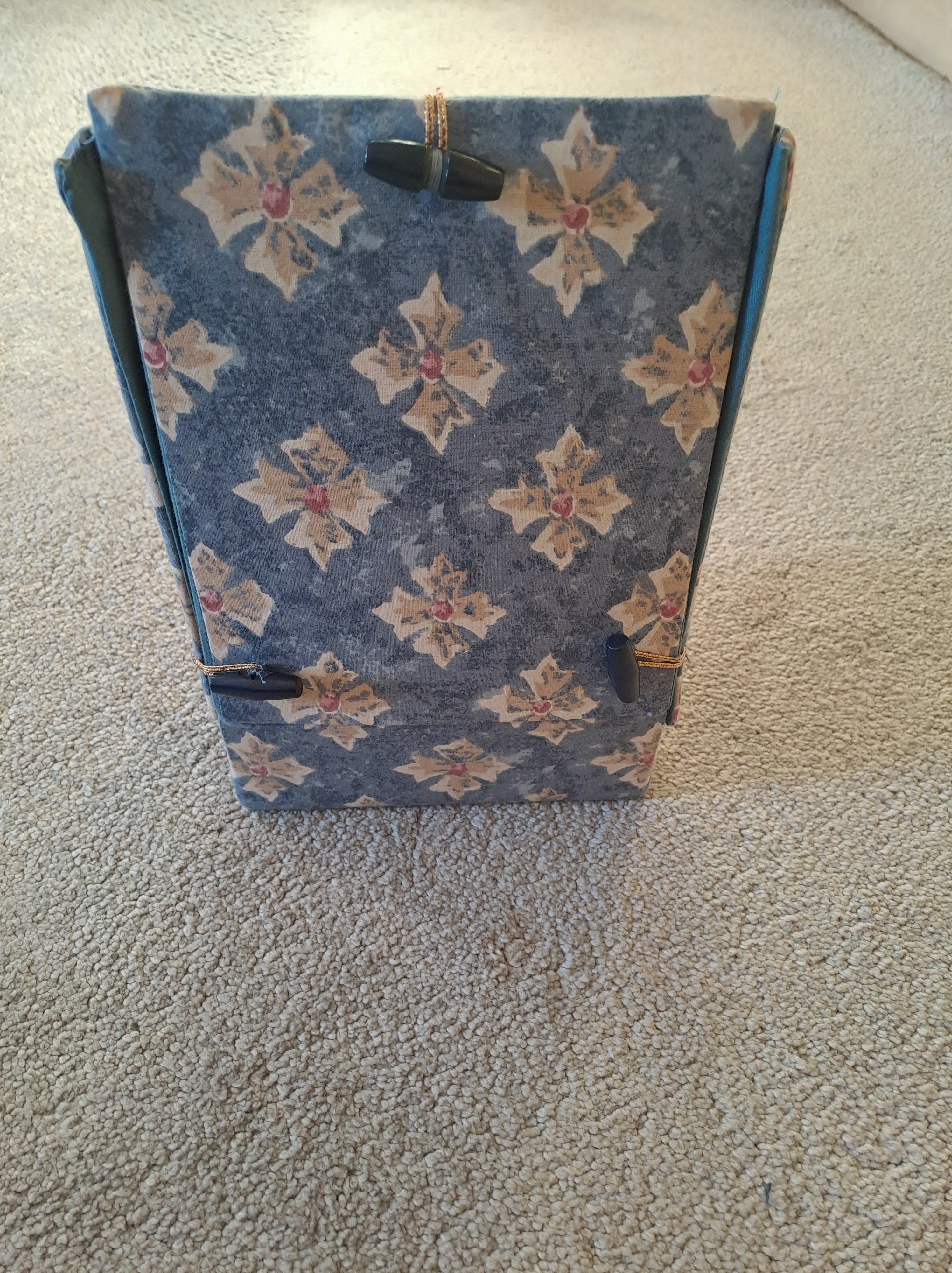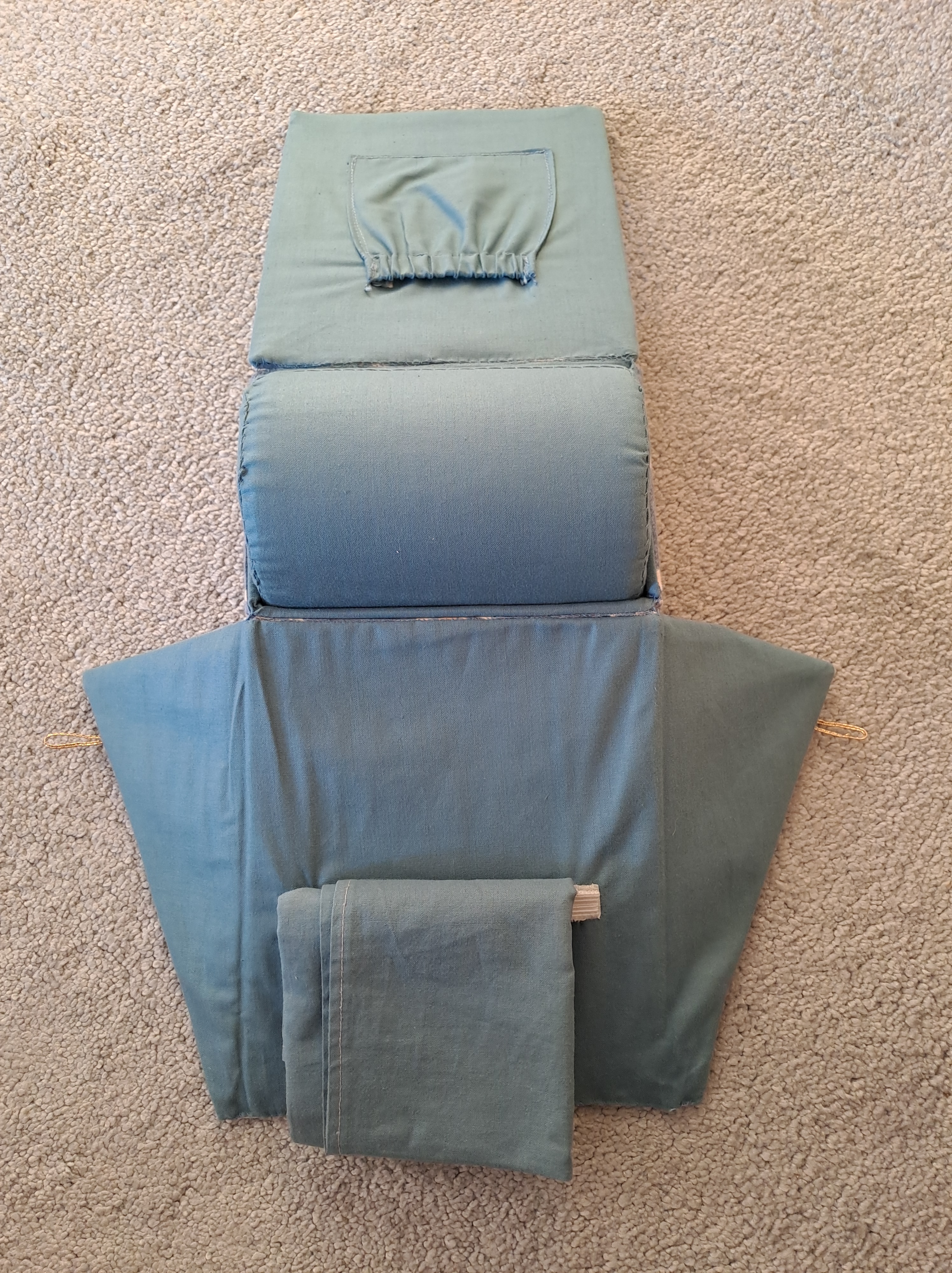 This is a homemade one I picked up at a recent meeting. The maker has used fabric-covered cardboard to create a portable pillow with pockets: