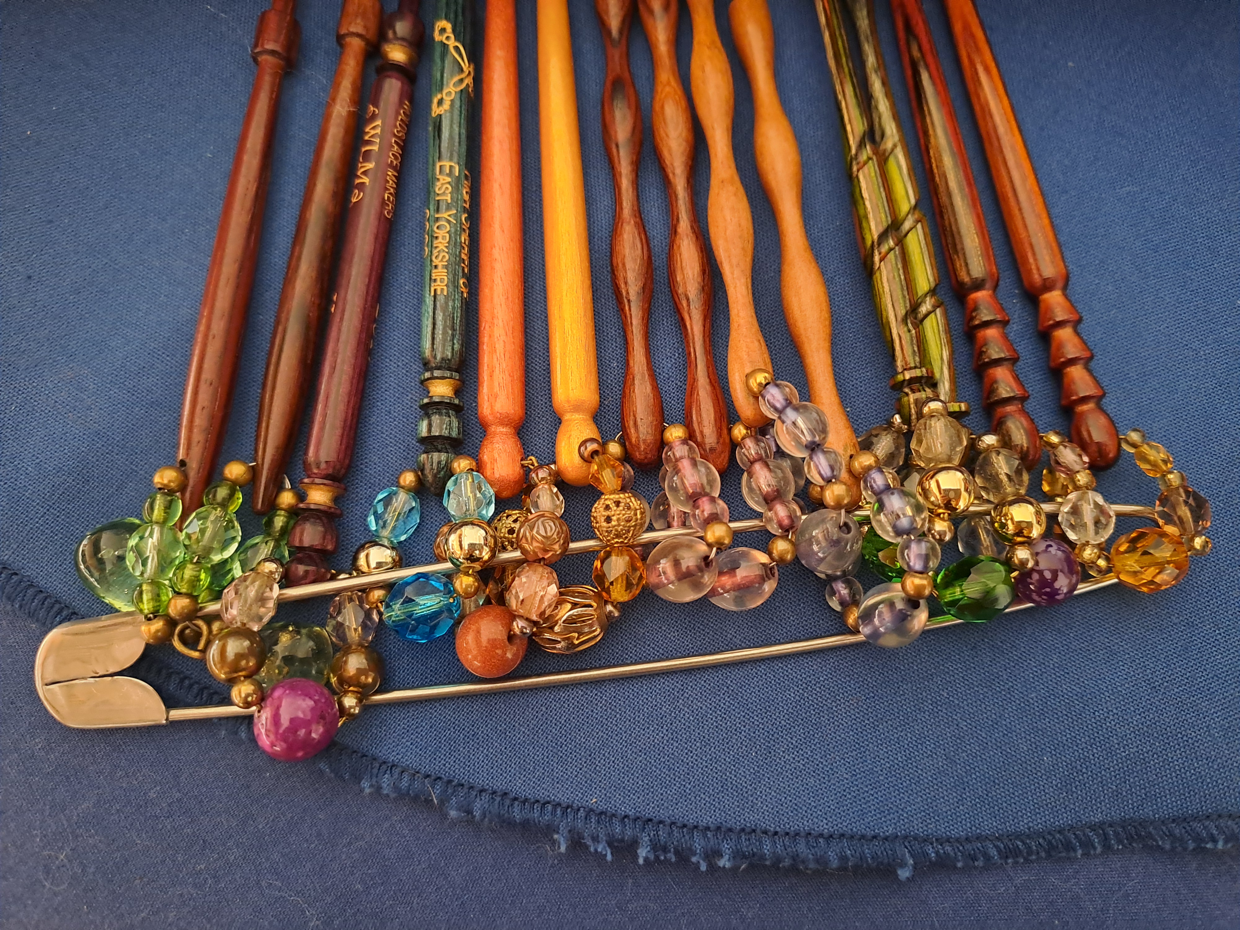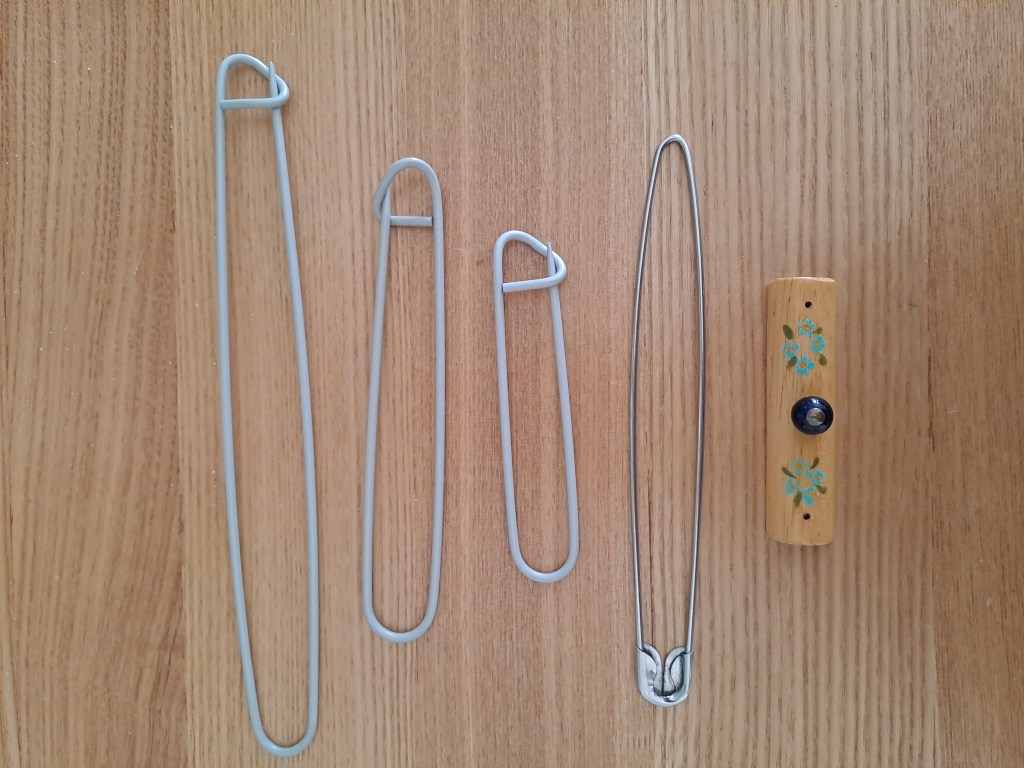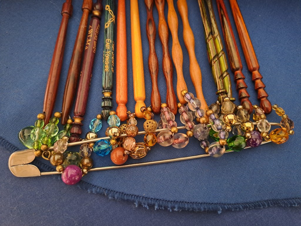 When transporting your lace cushion it’s really important to keep bobbins secured. If I’m using Midlands bobbins with spangles, I usually put a large stitch holder through the spangles and pin a cover cloth tightly over to keep them from rolling around, or if you haven’t got many pairs on your pillow you can use a strip of cloth and pin each pair down individually. There are also other bobbin holder options available from suppliers.