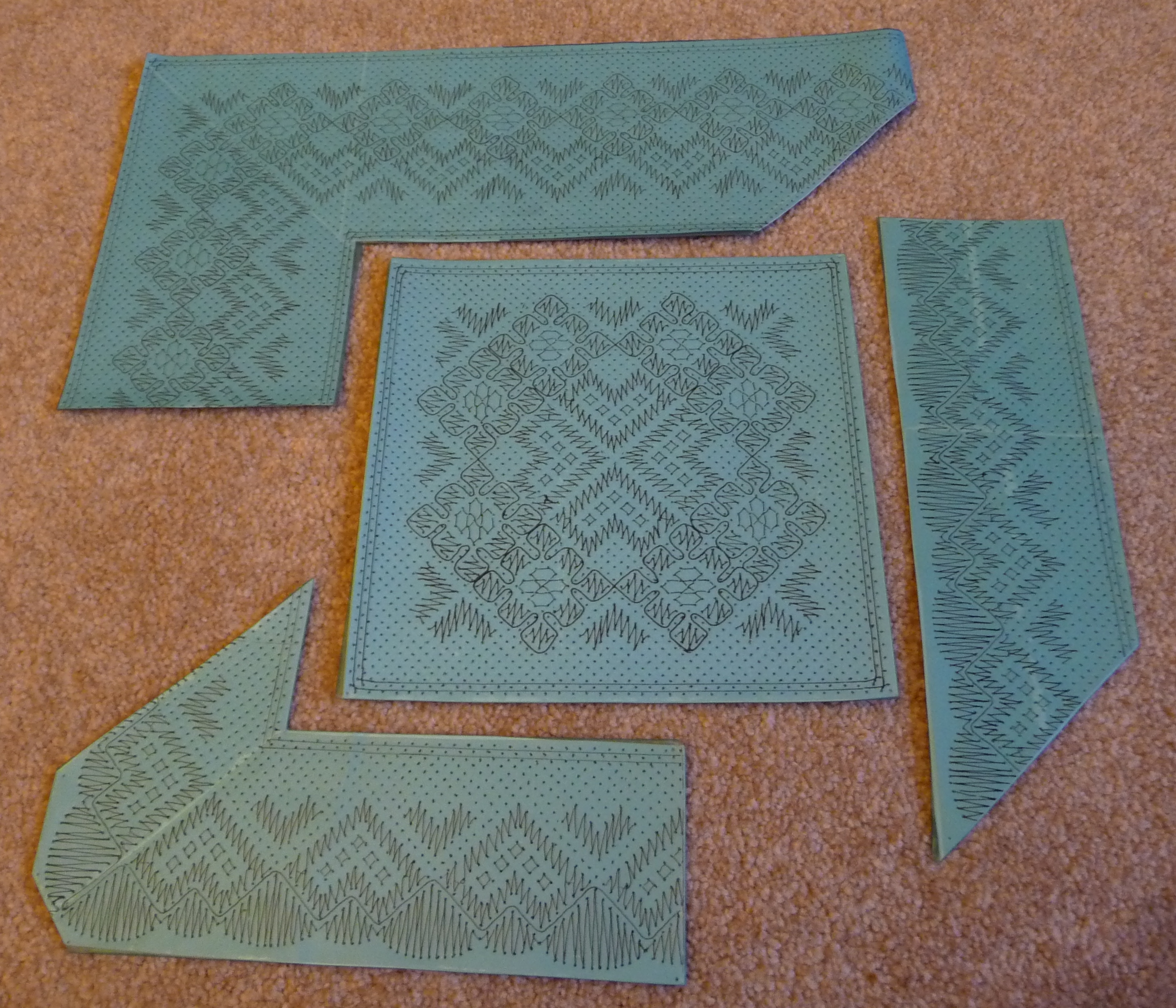 Blueing – The sticky-back covering used to cover patterns for e.g. Torchon and Beds lace to protect the pin holes from stretching or ripping and to provide a coloured background against which the thread shows up.