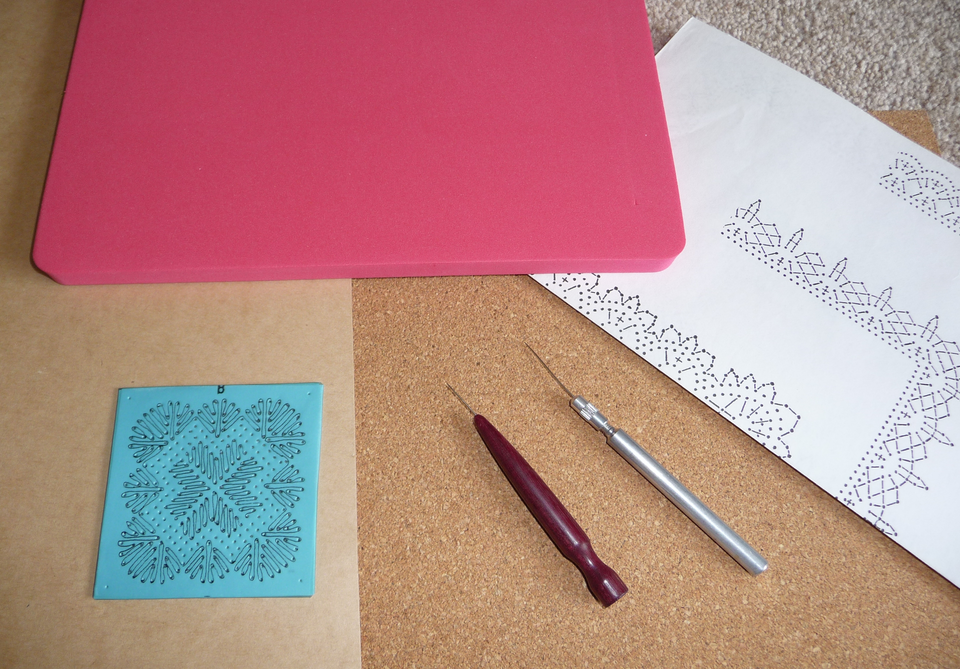 Pricking – Vb- to make a pricking is to prepare the pattern by making pin holes using a pricking tool. Preparing the holes in this way is more accurate than trying to do it when the work is in progress, and avoids pins being damaged.