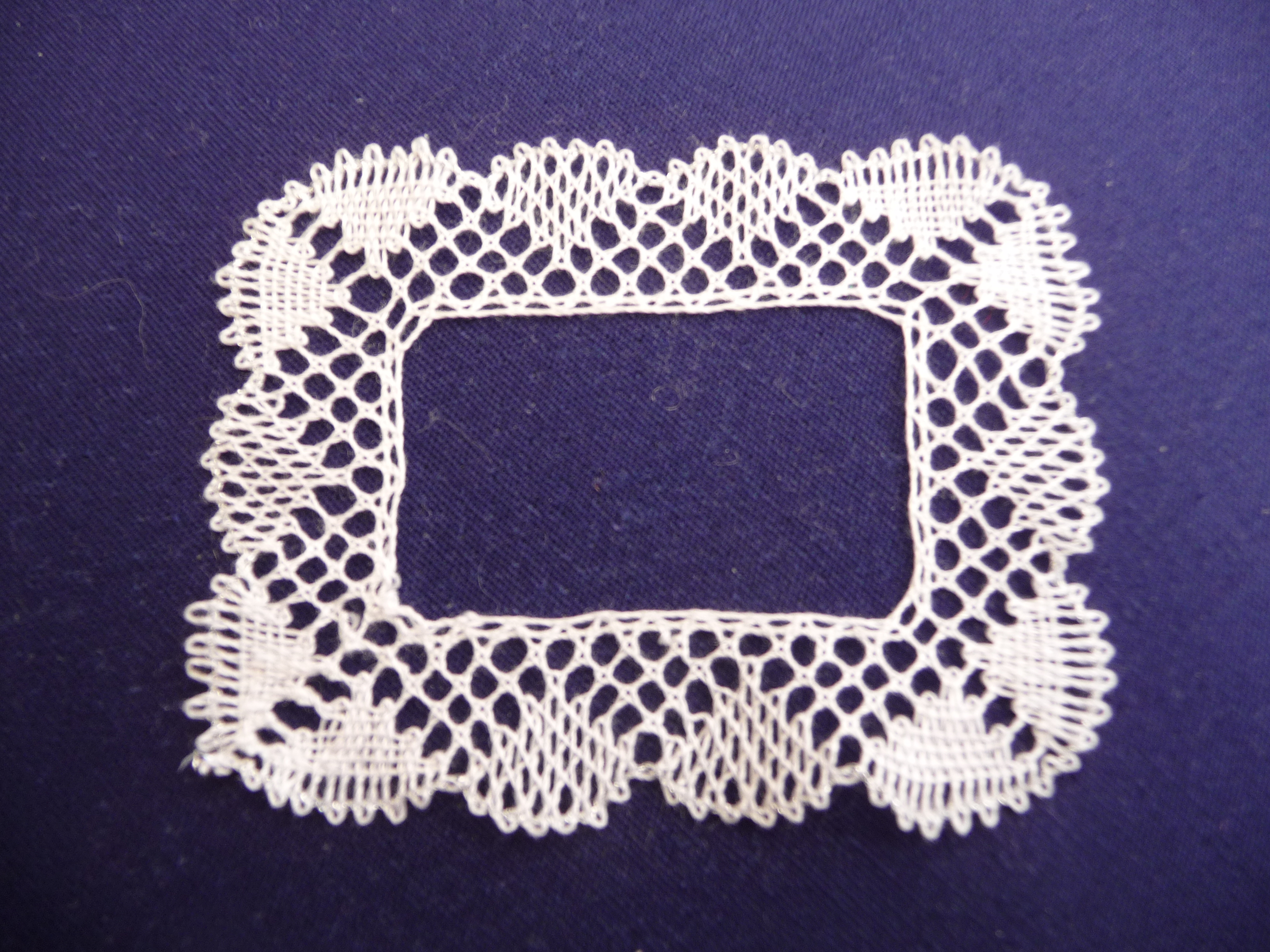 It can take some practice to do this without stretching the hole or splitting the thread, so take your time. There’s nothing worse than ruining a piece of lace by bad joining- trust me, I’ve been there. As an example, the piece worked in white thread below has been joined correctly; the piece on blue thread hasn’t. See how the holes have been stretched out of shape on the blue version (the join is on the bottom left corner). Consider yourself warned, my friends!