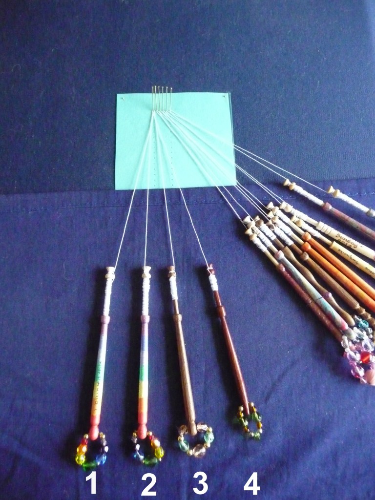 6. Take your worker pair and the first passive pair, and push the other pairs carefully to one side, but keeping them aligned so that their threads don’t get crossed over. Count the bobbins left to right 1-4. These numbers will relate to the position of the bobbin and not the bobbin itself.