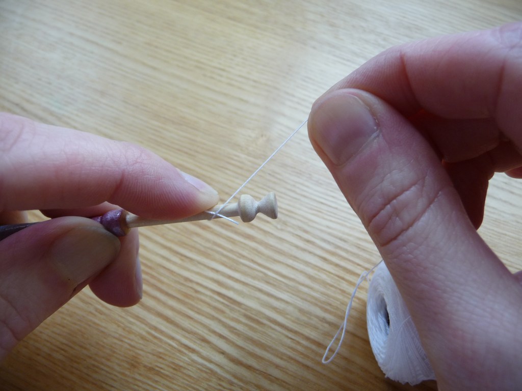 To make a hitch to keep the thread tight onto the bobbin, swap hands and put the bobbin in your right hand. Wind the thread round your left index finger twice, then slip the loops onto the end of the bobbin and pull it up so that all the thread doesn’t unravel.