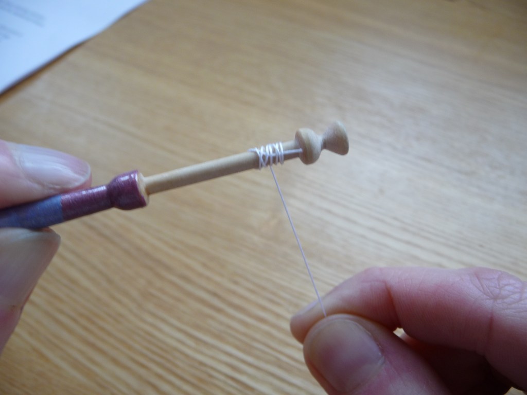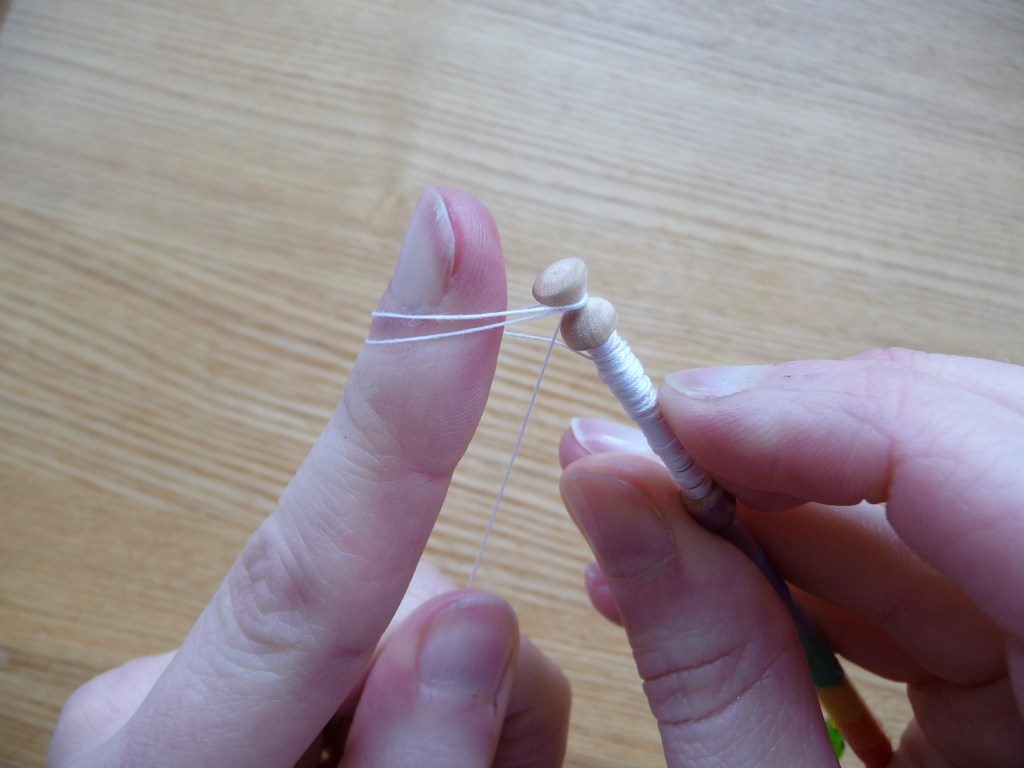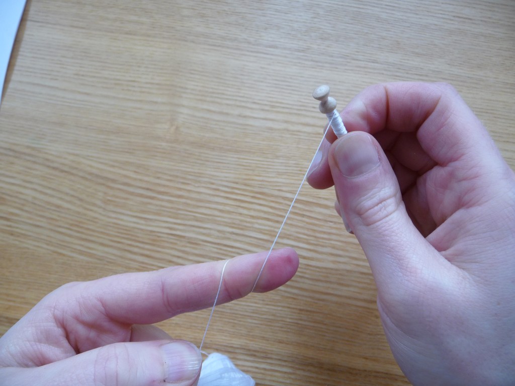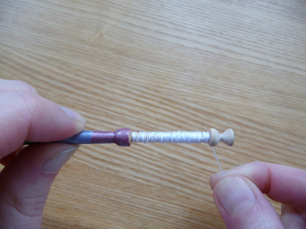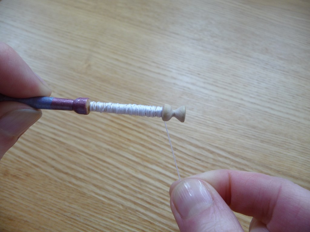 So once you think you’ve got enough thread, you need to wind roughly the same amount again, as this will be transferred to the second bobbin. (If you were making Honiton lace you could ignore this, as you would just wind thread onto each bobbin, then tie the ends together and hide the knot onto one of the bobbins).