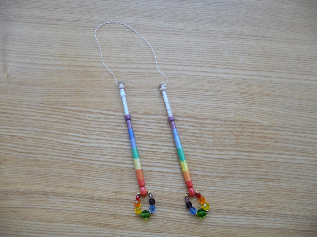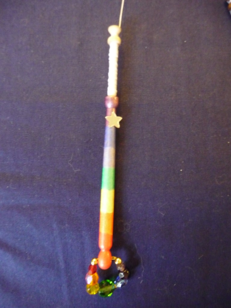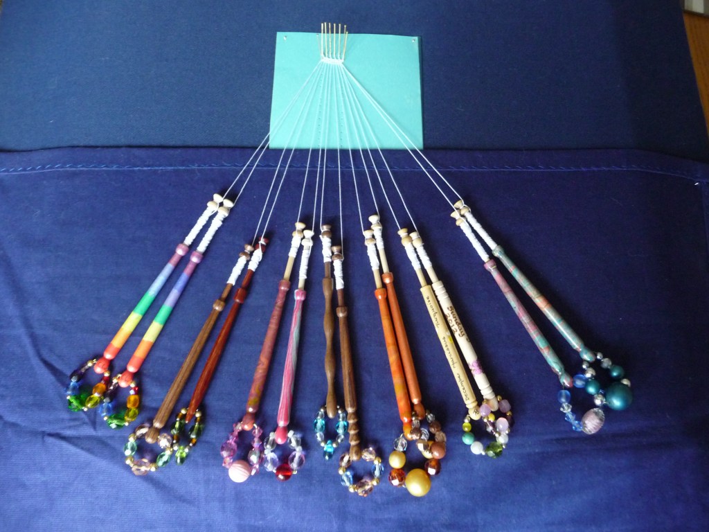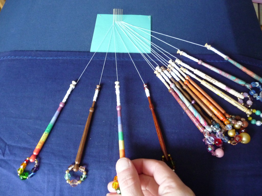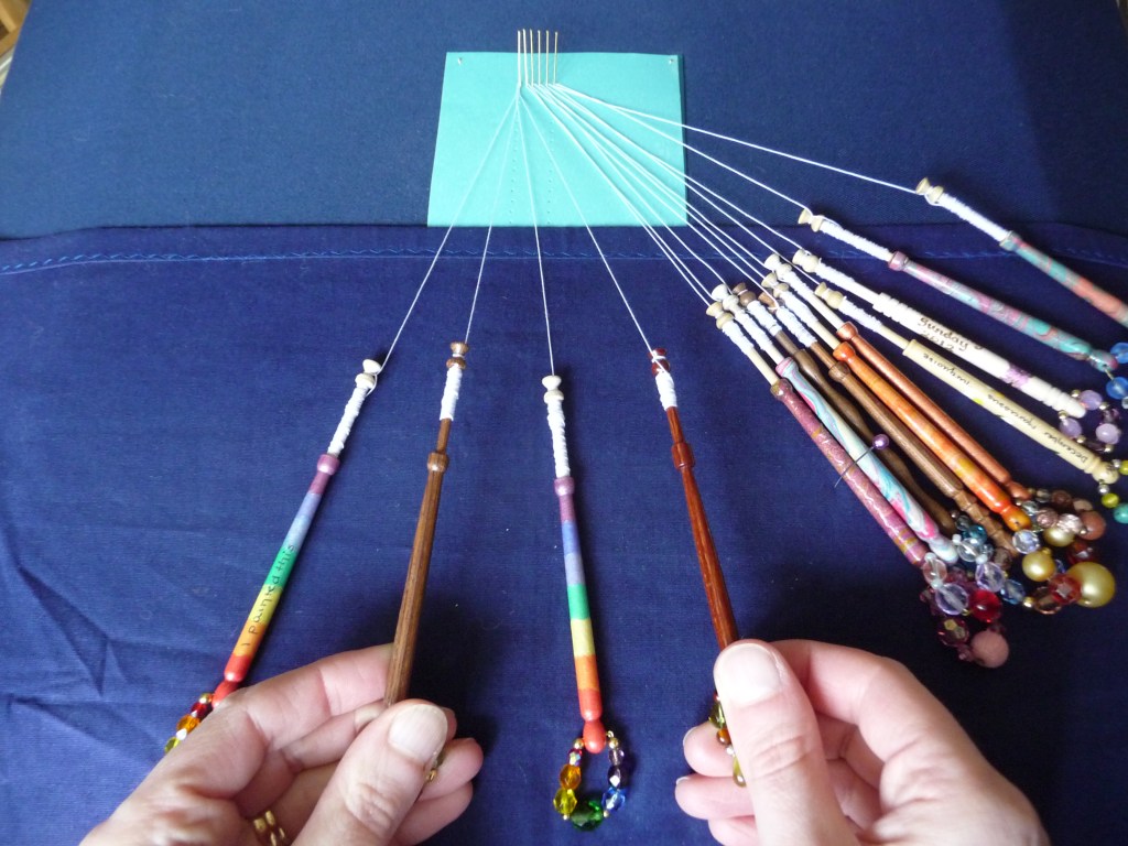 For this practice piece you will need seven pairs (six passive pairs and one worker pair) so you’ll have a bit of chance to practice your new winding prowess. Wind a little extra thread onto the pair that you’d like to be your worker pair as these will travel further and therefore use up more thread. If you have a pair of bobbins that are in some way different to the others (different colour, significant spangles etc) use these as your workers so that if you do get into a muddle, you know you’re using the right ones. For the pictures with this tutorial I used a pair of rainbow striped bobbins so that it is obvious which one is the worker pair and what it is doing.