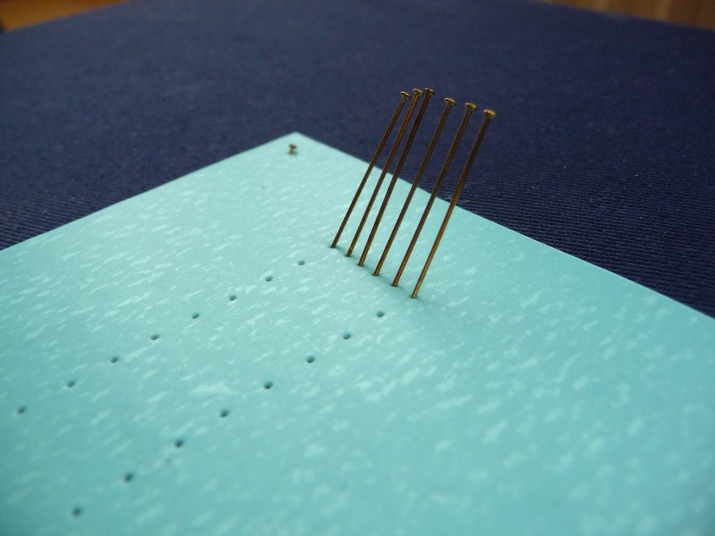 2. Put pins into each of the pin holes along the top of the strip, pushed in around a quarter of the way down and angled slightly backwards