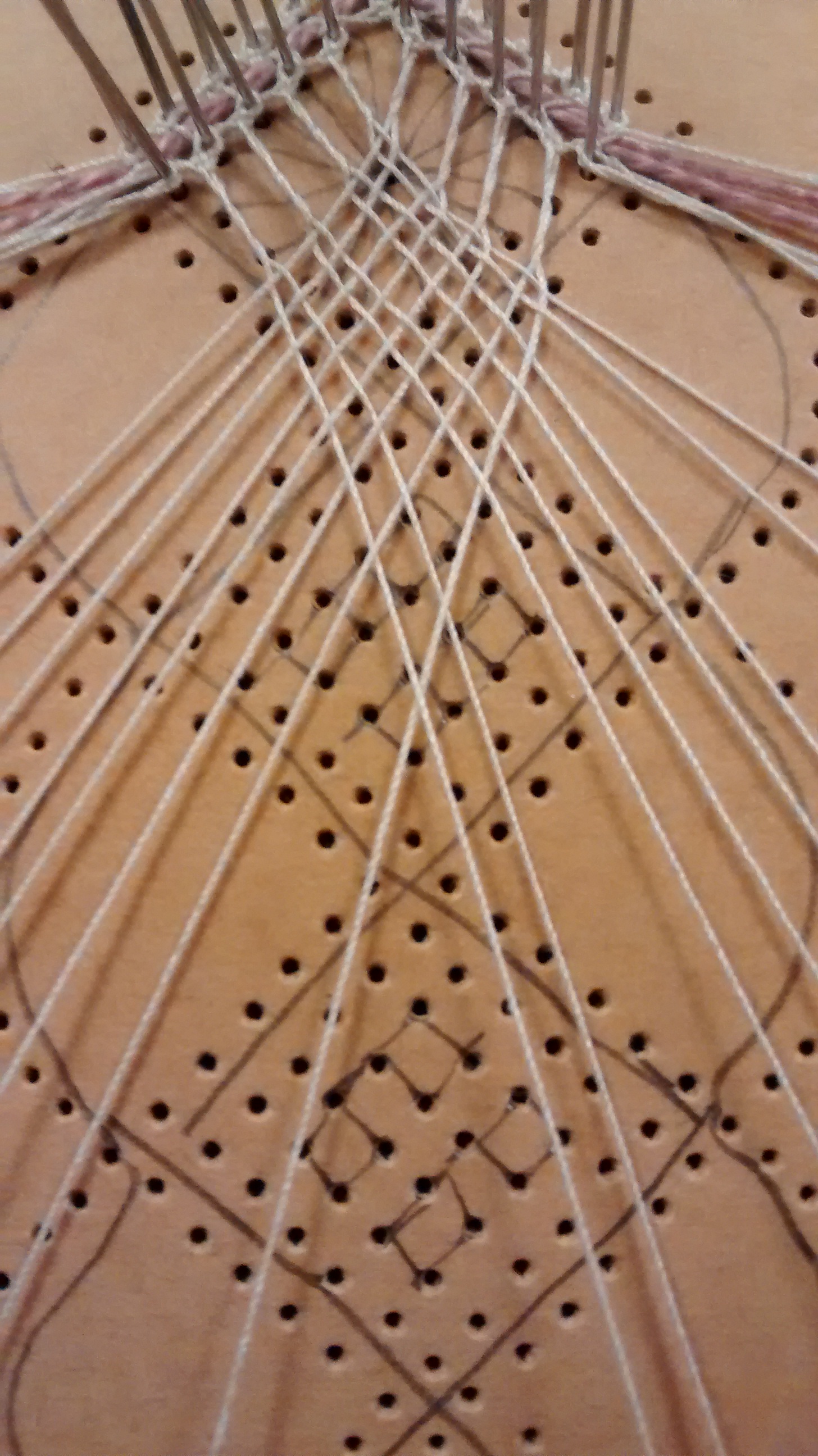 4. The next pair from the left then works whole stitch through the four pairs to its right, coming to rest to the left of the first worker pair.
